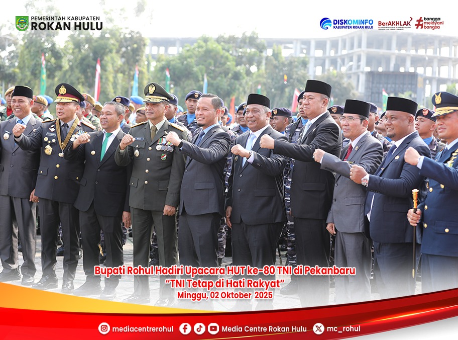 Pekanbaru | Faktanusantararaya.com – Dalam rangka memperingati Hari Ulang Tahun (HUT) ke-80 Tentara Nasional Indonesia (TNI) tingkat Provinsi Riau, upacara khidmat digelar di Halaman Kantor Gubernur Riau, Minggu (05/10/2025).Acara ini dihadiri oleh Gubernur Riau H. Abdul Wahid, Pangdam XIX/ Tuanku Tambusai Mayjen TNI Agus Hadi Waluyo, Kapolda Riau, Danlanud Roesmin Nurjadin, serta para Bupati dan Wali Kota se-Provinsi Riau, termasuk Bupati Rokan Hulu Anton, ST, MM.Dalam momentum istimewa ini, Bupati Rohul Anton menyampaikan ucapan selamat kepada seluruh jajaran TNI yang telah genap berusia 80 tahun. Ia menegaskan, keberadaan TNI yang tetap solid, profesional, dan dekat dengan rakyat merupakan kekuatan penting dalam menjaga keutuhan Negara Kesatuan Republik Indonesia (NKRI).“Atas nama Pemerintah Kabupaten Rokan Hulu dan seluruh masyarakat, kami mengucapkan selamat HUT ke-80 TNI. Kami bersyukur karena hingga hari ini, TNI tetap menjadi benteng pertahanan bangsa dan selalu hadir di hati rakyat,” ujar Bupati Anton.