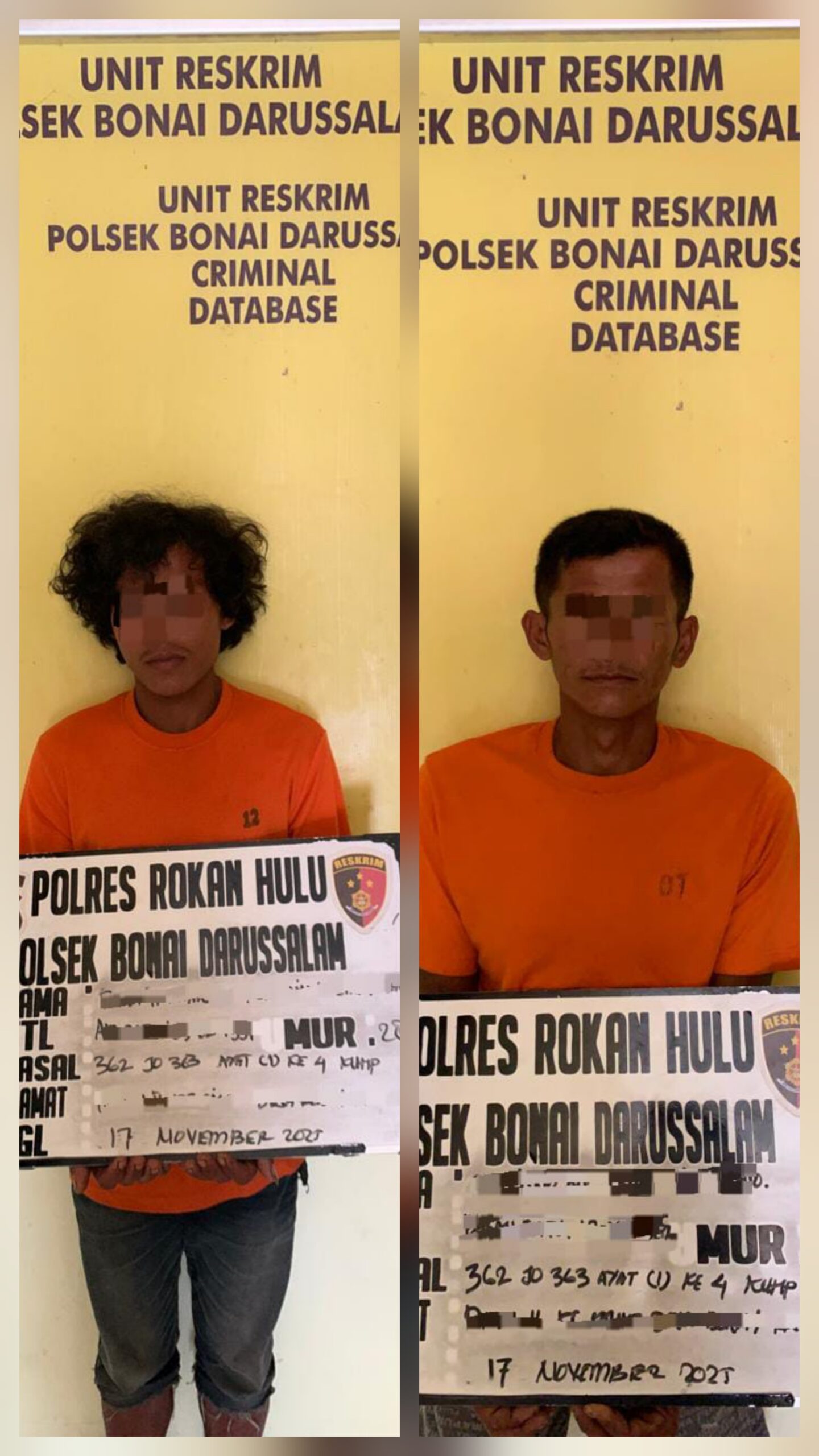 Mereka diduga melakukan pencurian pada pagi hari sekitar pukul 07.00 WIB. Setelah menerima informasi tersebut, Kapolsek Bonai Darussalam memerintahkan Kanit Reskrim Aipda Mirwan Agusman, S.H., bersama anggota untuk melakukan penyelidikan. Pada pukul 19.00 WIB, kedua pelaku resmi dibawa ke Mapolsek Bonai Darussalam untuk diproses lebih lanjut.