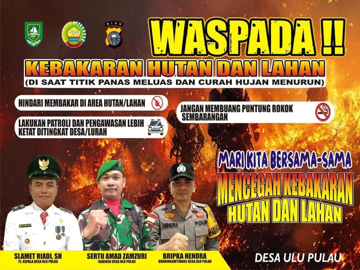 Dalam mencegah Kebakaran Hutan dan Lahan (Karhutla) PJ Kepala Desa Ulu Pulau Bapak Slamet Riadi,SH, dan atas nama Pemerintah Desa Ulu Pulau, Bhabinkamtibmas Bripka Hendra dan Babinsa Sertu Amad Zamzuri menyampaikan himbauan terkait larangan membakar Hutan dan Lahan melalui maklumat kepada warga.