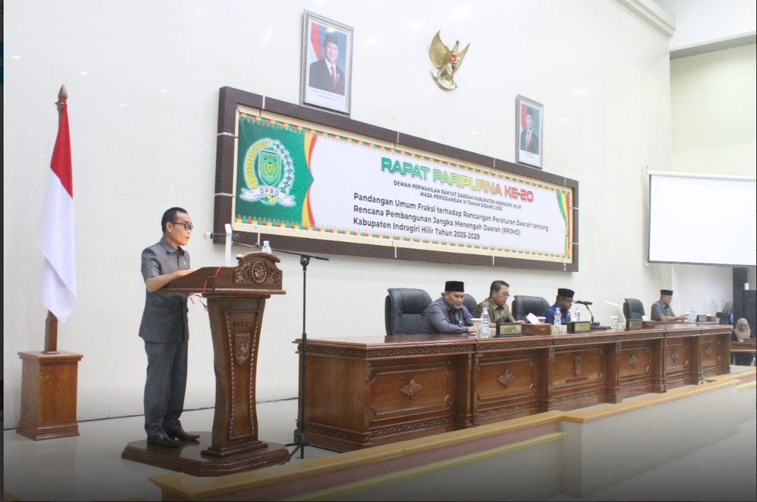 Faktanusantararaya.com, Inhil – Dewan Perwakilan Rakyat Daerah (DPRD) Kabupaten Indragiri Hilir menggelar Rapat Paripurna Ke-20 Masa Persidangan III Tahun Sidang 2025. Agenda ini membahas pandangan umum fraksi terhadap pidato Bupati Inhil mengenai Rancangan Peraturan Daerah tentang Rencana Pembangunan Jangka menengah Daerah (RPJMD) Kabupaten Indragiri Hilir Tahun 2025 – 2029.