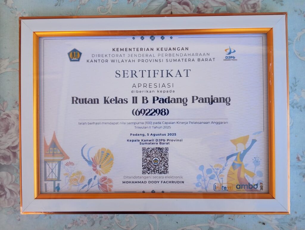 Faktanusantararaya.com, Padangpanjang_Rumah Tahanan Negara (Rutan) Kelas IIB Padang Panjang meraih penghargaan bergengsi atas capaian kinerja pelaksanaan anggaran terbaik semester pertama tahun anggaran 2025 dengan nilai sempurna 100.