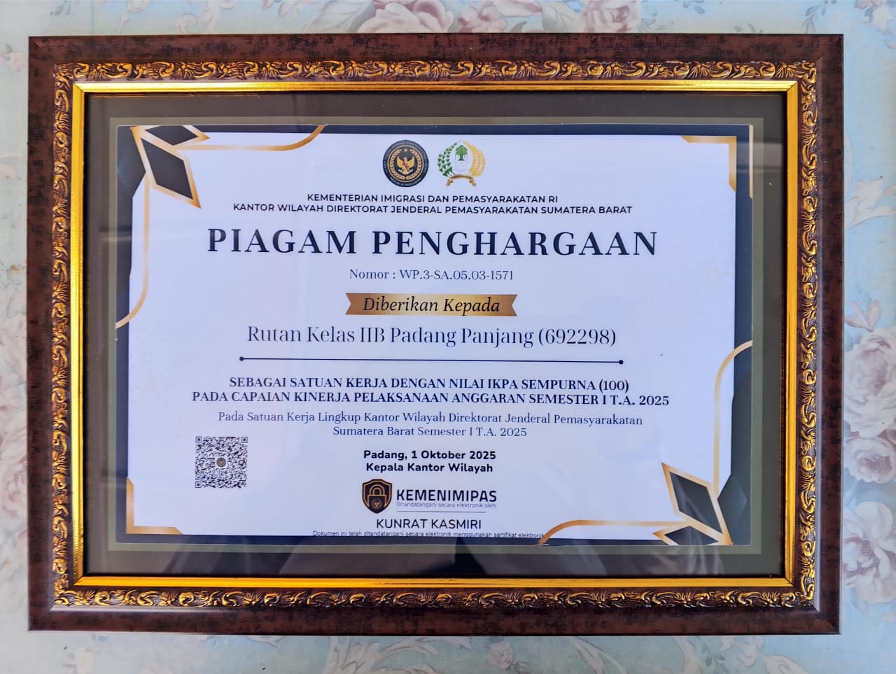 Faktanusantararaya.com, Padangpanjang_Rumah Tahanan Negara (Rutan) Kelas IIB Padang Panjang meraih penghargaan bergengsi atas capaian kinerja pelaksanaan anggaran terbaik semester pertama tahun anggaran 2025 dengan nilai sempurna 100.