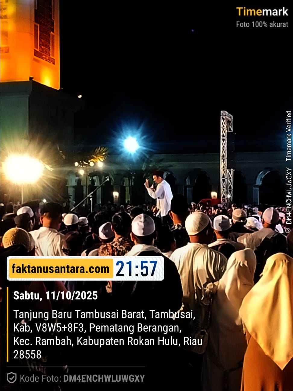 Faktanusantararaya.com, Rohul — Malam itu, Sabtu (11/10/2025), pelataran Masjid Agung Islamic Center Pasir pengaraian tampak semarak. Meski hujan mengguyur sejak sore, ribuan masyarakat Kabupaten Rokan Hulu (Rohul) tetap memadati lokasi, berpayung dan beralas seadanya, demi satu tujuan menghadiri Tabligh Akbar dalam rangka menyambut Hari Ulang Tahun (HUT) Kabupaten Rokan Hulu ke-26.Suasana religius terasa begitu kental.