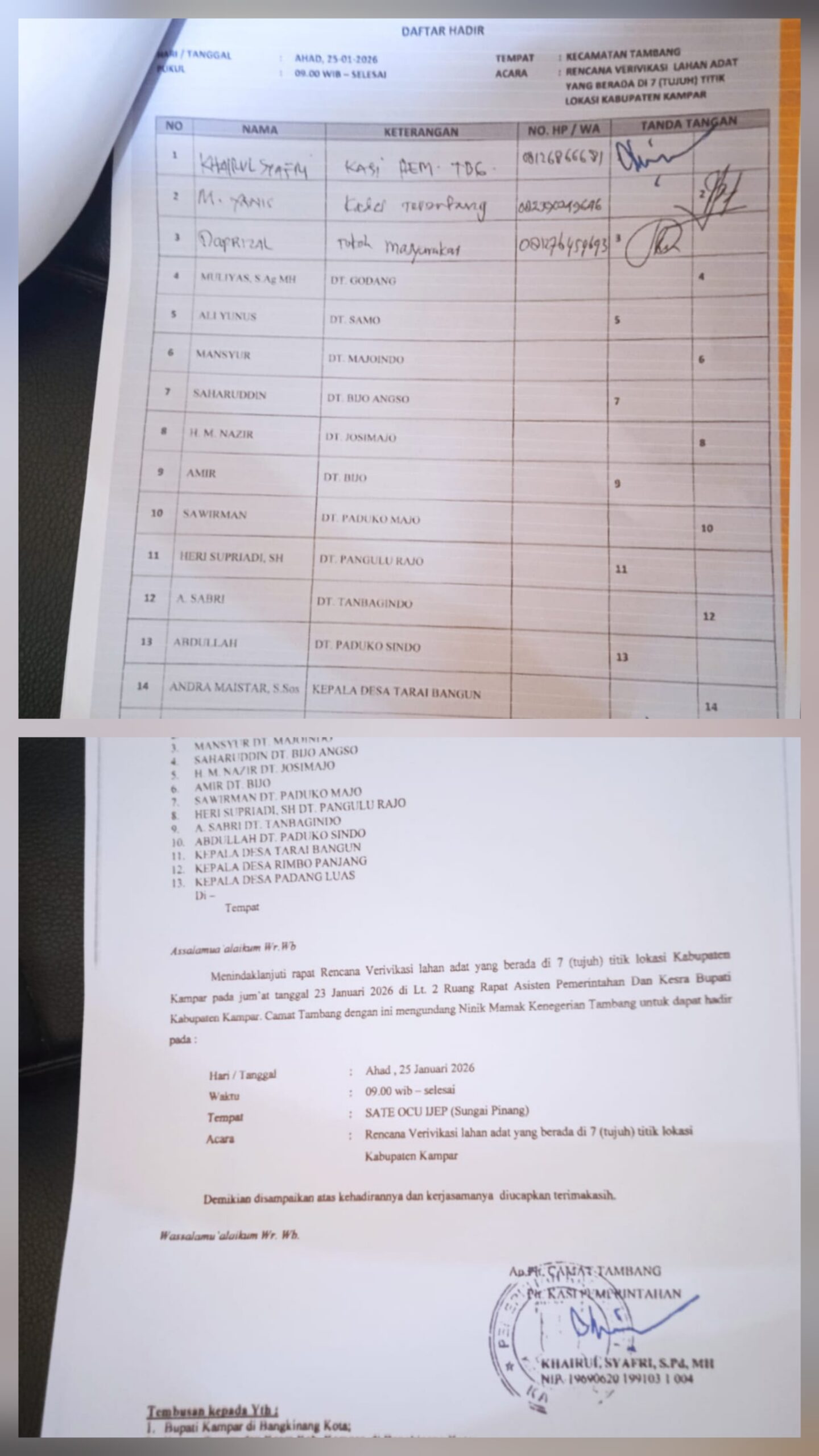 Berdasarkan surat tersebut, Camat Tambang menerbitkan surat undangan nomor No: 005/PEM/ 023 tanggal 23.Januari 2026 ditandatangani Khairul Syafri S.Pd, MH., Kasi Pem Camat Tambang Dengan judul:Menindaklanjuti rapat Verifikasi lahan Adat yang ada di 7 Titik lokasi di Kampar Jum’at 24 Januari 2026 diruangan Kesra Bupati Kampar. Camat Tambang mengundang Ninik mamak Kenagarian Tambang Ahad, 25 Januari 2026 pukul 09.00 wib – selesai, tempat Sate Ocu Jep (Sungai Pinang) dengan tujuan Rencana Verivikasi lahan adat.