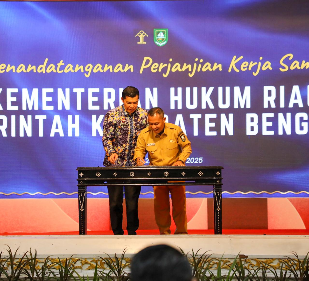 Faktanusantararaya.com, PEKANBARU, Wakil Bupati Bengkalis Dr.H.Bagus Santoso melakukan penandatanganan perjanjian kerjasama antara Kepala Kantor Wilayah Kementerian Hukum Riau Rudy Hendra Pakpahan dengan Pemerintah Daerah Bengkalis tentang sinergitas dalam pengharmonisasian, pembulatan, dan pemantapan konsepsi dan fasilitasi pembentukan produk hukum daerah, pembinaan hukum, serta implementasi penyelenggaraan kekayaan intelektual dan penyelenggaraan administrasi hukum umum di daerah.
